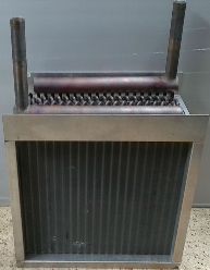 QTY. 1. GENMECH SUPER RADIATOR COILS NO: V306724,B01, NO: H03411-001 25 X 24 12R-12/120 FLUID COIL WITH SEALED END PLATES THIS FLUID COIL WAS BUILT USING COPPER TUBE, ALUMINUM FIN, AND COPPER HEADERS. THE HEADERS ARE OUTFITTED WITH VENTS AND DRAINS WHICH HELP REMOVE AIR DURING INSTALLATION AND MAINTENANCE. ADDITIONALLY, THIS FLUID COIL HAS SEALED END PLATES TO PREVENT LEAKAGE OF BOTH CONDENSATE AND AIR. MEASUREMENTS: 28" X 30" X 15 ½", COPPER 1 ¾" X 12" LONG THREADED INLET, AND COPPER 1 ¾" X 12" LONG THREADED OUTLET. photo
