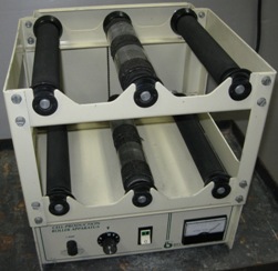 QTY. 1. BELLCO BIOTECHNOLOGY CELL PRODUCTION VESSEL ROLLER APPARATUS, CAT NO: 7622-02020, SERIAL NO: E4PRA-283, 6 ROLLERS, POWER: 115 VOLTS, HERTZ: 60, AMPS: 1. THE BELLCO ECONOMY ROLLER APPARATUS IS A VARIABLE SPEED TWO OR FOUR BOTTLE ROLLER APPARATUS USED FOR THE PURPOSE OF PRODUCING ANIMAL CELLS OR CELL PRODUCTS. THIS SMALL SIZED UNIT IS IDEAL FOR EXPERIMENTAL AND PILOT-SCALE CELL CULTURE. METHODS DEVELOPED ON THIS UNIT CAN EASILY BE SCALED UP USING THE SAME TECHNOLOGY TO PRODUCTION SIZED UNITS WITH A CAPACITY OF 90, 100 OR 172 BOTTLES. BELLCO'S FULL SIZE MODULAR UNITS CAN BE INCREASED IN CAPACITY IN 10 BOTTLE INCREMENTS AS WELL. THE UNIT FEATURES A HEAVY-DUTY DC MOTOR AND SOLID-STATE ELECTRONICS FOR RELIABLE OPERATION. THE UNIT INCLUDES ALL-POSITION DRIVE BELTS SO THAT EVERY ROLLER ROTATES, THUS PREVENTING SLIPPAGE OF LIGHT-WEIGHT PLASTIC BOTTLES. AN ANALOG TACHOMETER DISPLAYS BOTTLE SPEED. BELLCO'S UNIQUE HEX-SHAPED SHAFTS PREVENT ROLLER SLIPPAGE AND PRODUCE POSITIVE DRIVE. SPECIFICATIONS: ELECTRICAL RATING: 115 +/- 10 VAC @ 60 HZ LINE VOLTAGE, 1.0 AMP @ 115V 60 HZ POWER CONSUMPTION. DIMENSIONS: 14?W X 12.8?D X 14.4?H (36X33X37CM). WEIGHT: 21.5 LBS (9.8 KG). BOTTLE SPEED: 0.25 - 3.0 RPM. ENVIRONMENTAL CONDITIONS (OPERATING): INDOOR USE, POLLUTION DEGREE 2, 4° TO 50° C, RELATIVE HUMIDITY 0-90%, NON-CONDENSING. ENVIRONMENTAL CONDITIONS (NON-OPERATING): -10° TO 60° C, RELATIVE HUMIDITY 95% MAXIMUM. photo